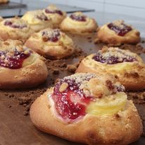 De Streusselkoeken zijn gemaakt van brooddeeg met daarop gele room, abrikozen/kersen en kruimel. Een zoete verwennerij!