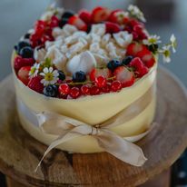 Dit taartje is gevuld met een luchtige mousse van frambozen, gevuld met vanille biscuit en afgewerkt met een rand van witte chocolade en rood fruit.
